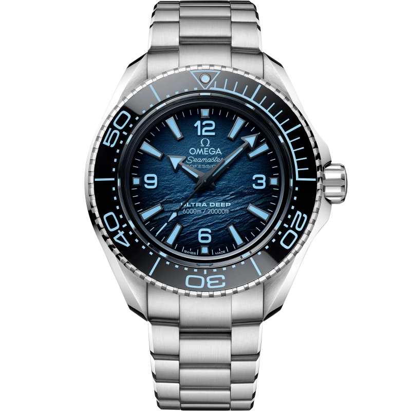 Discover the stunning new Seamaster Planet Ocean Ultra Deep in O-MEGA steel, with blue-black gradient dial and black structured rubber strap. Check the water resistance. This is a dive watch built to